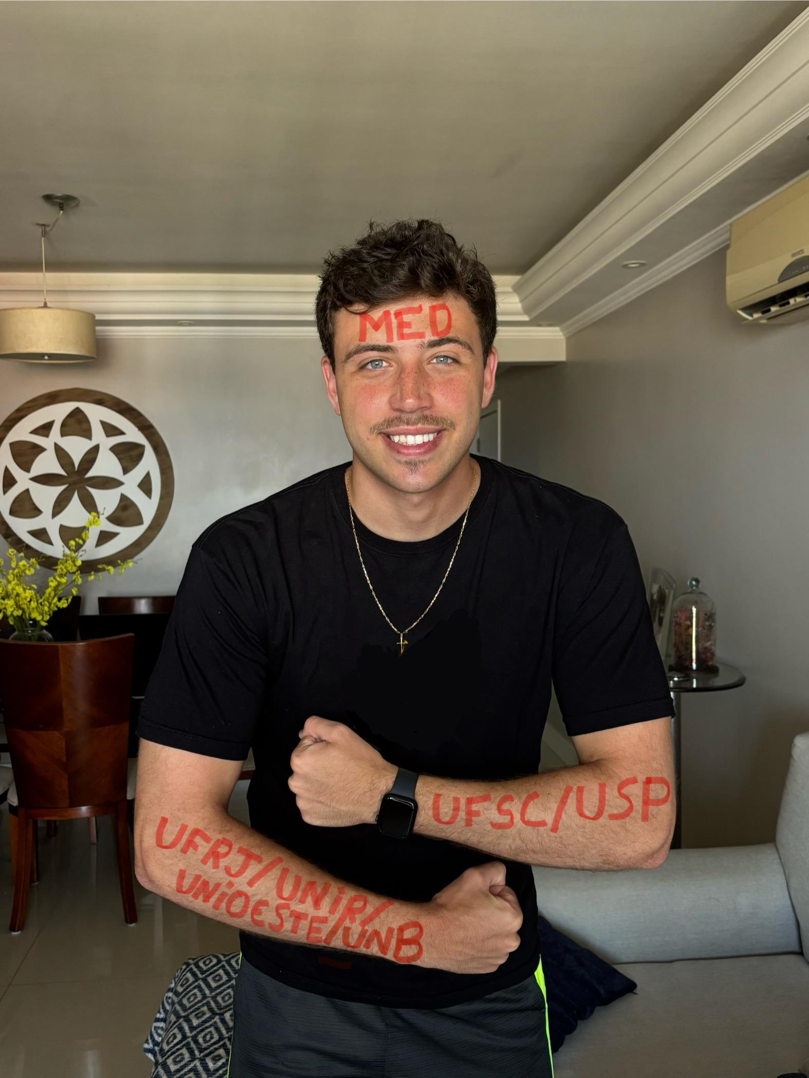 Meu nome é Antônio Augusto, tenho 21 anos, sou de Florianópolis, não possuo familiares médicos e vim da ampla concorrência com uma média inicial de 680 no ENEM. Após cursar 1 ano de Odontologia na UFSC, decidi apostar tudo no meu verdadeiro sonho: Medicina. Tranquei o curso, enfrentei um ano e meio de estudos, o qual me permitiu chegar a 166 acertos e 832,8 de média no ENEM, uma das maiores do país, e fui aprovado em instituições como USP, UFRJ, UnB, Unioeste, UNIR e UFSC, onde fiquei entre os primeiros colocados. Hoje, além de cursar Medicina, atuo como mentor de MILHARES de alunos em grandes plataformas online e presencial em que os auxilio a trilharem esse mesmo caminho de superação e conquista.
